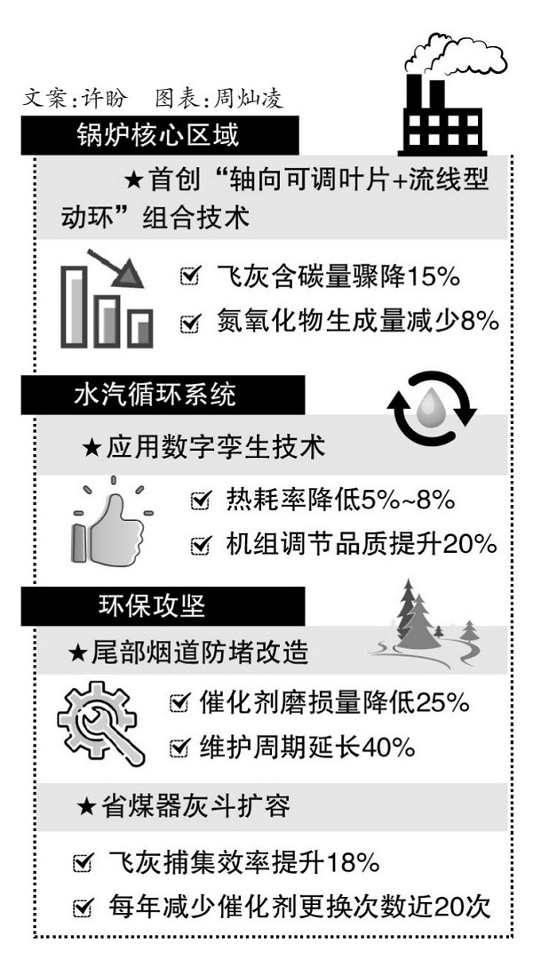 在环保攻坚战中,项目团队打出一套组合拳。尾部烟道防堵改造采用“耐磨涂层﹢模块化布置”,辅以烟道整流格栅优化气流,使催化剂磨损量降低25%,维护周期延长40%。省煤器灰斗扩容后,飞灰捕集效率提升18%,每年减少催化剂更换次数近20次。这些看似枯燥的数据,换算成环保效益却很惊人:单台机组年减排烟尘120吨、二氧化硫80吨、氮氧化物150吨,相当于种植了8000亩森林。