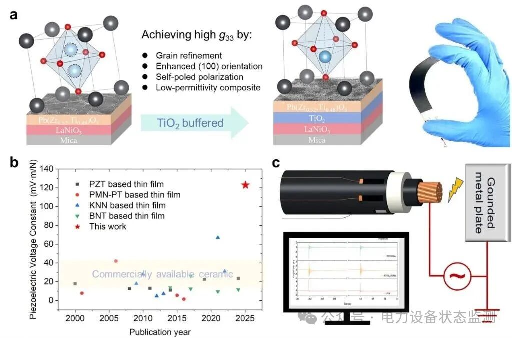 针对这一瓶颈,西安交通大学电气学院钟力生、高景晖教授团队提出了一种柔性压电薄膜的缓冲层调控性能提升策略,通过在Pb(Zr₀.₅₂Ti₀.₄₈)O₃(PZT)薄膜下方引入TiO₂缓冲层:一方面,利用缓冲层的低介电常数降低复合薄膜的等效介电常数;另一方面,通过缓冲层促进PZT晶粒细化、提升择优取向和诱导自极化效应,大幅提升了PZT薄膜的压电系数,实现了柔性压电材料传感性能显著提升。通过该方案获得了压电电压系数高达124 mV·m·N⁻¹的柔性压电薄膜,研制的柔性超声传感器件为电缆局部放电声学检测提供了新型传感解决方案。