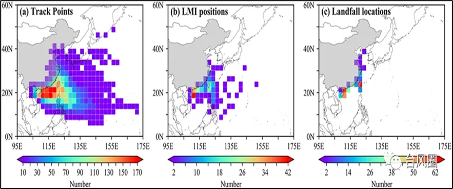 台风路径点(b)台风生命史最大强度(LMI)位置(c)登陆位置的空间分布