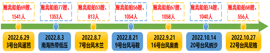 2022年广东公司成功撤离船舶464艘次和相关人员7415人次,2023年成功撤离船舶241艘次和相关人员4704人次,实现了防台撤离人船零伤害,工作成效总结为以下四个方面: