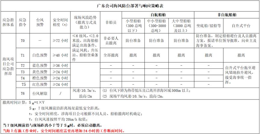 为做好海上施工单位人员和船舶的有序撤离工作,广东公司在考虑施工船舶撤离所需时间、台风移动速度、海上工作断面等重要因素后,针对性地制定了海风防台撤离策略。