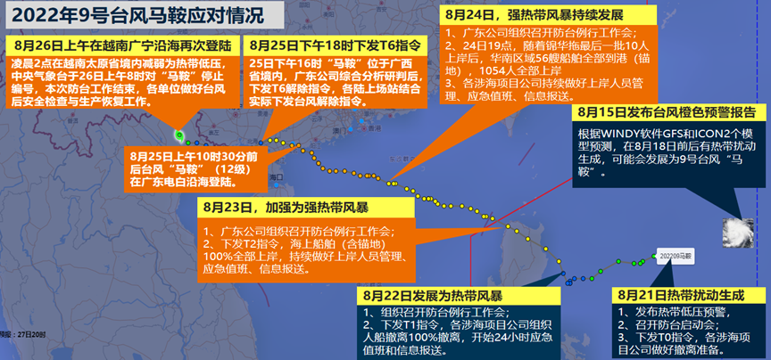 2018年10月随着广东公司第一个海风项目——阳江南鹏岛海风项目启动建设,海上防台应急工作成为广东公司安全生产工作的重中之重,广东公司积极学习和借鉴行业内外成功防台经验,用于海风项目防台工作,并在历年防台工作中总结和提升。2022年7月2日广东阳江“福景001”因台风走锚发生沉船事故,造成25人死亡、1人失踪。海风项目防台应急工作再次被提高到前所未有的高度。