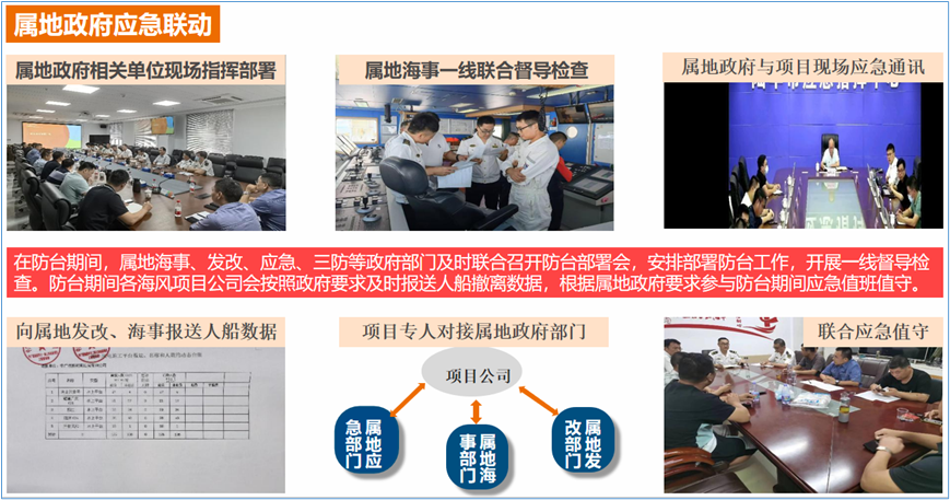 为做好与属地政府的应急联动,防台期间广东公司各涉海项目公司积极与属地海事、发改、应急、三防等政府部门对接,根据属地政府防台要求,成立现场联合指挥部,开展联合应急值守和联合督导检查等系列工作,严格执行属地政府防台指令要求。