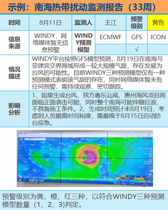 为提前预测台风信息,广东公司通过气象软件实时监测南海和其它海域气象条件,一旦发现有热带扰动生成,根据ECMWF欧洲气象中心、GFS美国国家海洋和大气管理局、ICON德国气象局3家主流气象软件判断预警级别,当3种气象软件都预测有台风生成,预警级别达到最高级别——红色预警。然后,将红色预警信息发给专业气象机构做出分析预报,每12小时发布台风预警信息,提醒各单位做好防台准备。通过气象软件可以提前7—15天预测到台风生成的信息,从而给海上施工作业单位争取到足够长的时间做好防台准备工作。