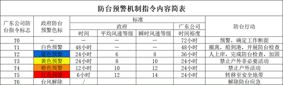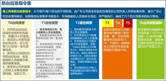 在防台应急工作中,尤其是在海上撤离时,将上级防台工作要求准确、及时传达到现场是防台成功的首要条件。为了实现这一目标,广东公司在广东省白色、蓝色、黄色、橙色、红色台风预警的基础上,制定了相对应的T0到T6的防台指令,并通过书面形式下发到现场,使现场准确、清楚地知道防台指令,并精准执行指令内容,确保了历次防台的成功。