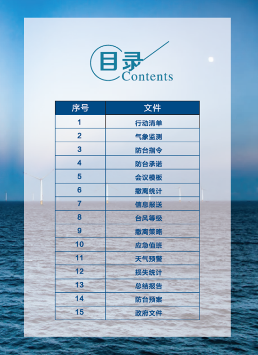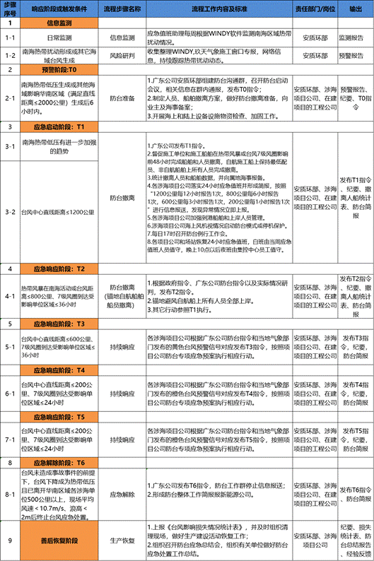 为做好台风应对,确保公司员工生命和财产安全,广东公司制定了防台专项应急预案,并在此基础上形成了防台标准响应清单,固化防台各项动作。同时,针对海风项目制定了符合海上作业实际情况的防台撤离策略,用以指导海上施工作业的防台应急工作。