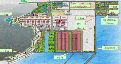 厂区防汛按50年一遇设计。在设计上充分利用厂区上游的大坑水库、鹅尾尖水库,起到截洪和缓冲作用。厂区设立了防洪坝、防浪墙、防浪堤(采用50年一遇设计,可防7米浪高),山体侧设置排洪渠、厂内铺设地下雨排水管网,分区分流排水,保证厂区安全。