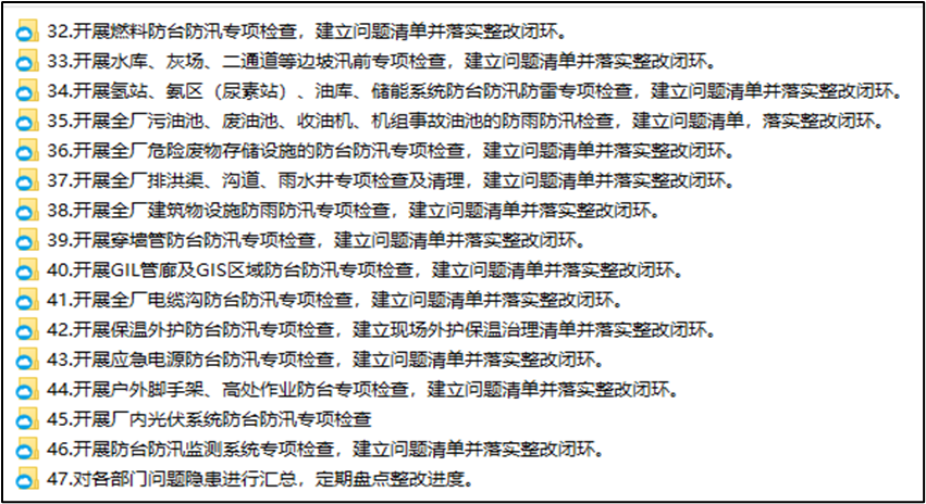 公司自2021年建立防台防汛工作备案清单机制,逐步优化形成7个方面47个固定项目,其中动员部署6项,制度标准5项,演练培训4项,设施清单9项,应急通讯与物资7项,专项检查16项。通过定期工作清单化管理,不仅提高预防工作的系统性和规范性,而且通过不断优化,能够迅速、有序地采取有效应对措施,最大限度地减少灾害带来的损失。
