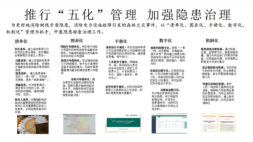 积极推进“五化”管理(清单化、图表化、数字化、手册化、机制化)落地。实现了彻查电力线路周边危险树木,做到隐患台账清晰、治理措施明确,确保了可能引起火灾隐患的周围植被与线路保持足够安全距离。明晰了重点火灾风险防范区域,确保全部风险可控、能控、在控。