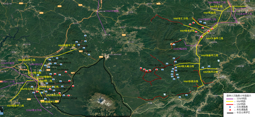 实现差异化治理长白山地区重要输、配电线路通道树线矛盾隐患,提升了火灾易发时段线路运维水平,明晰了日常工作中防范森林火灾的具体措施,实现了人防、物防、技防齐发力,保证了不发生输配电线路引发森林火灾事件,不发生森林火灾引起的输配电线路故障。