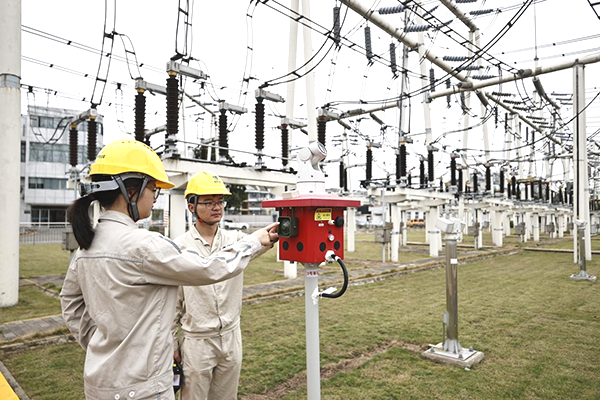 2025年10月9日,在220千伏走马羊变电站内,国网重庆市南供电公司工作人员正在对新上岗的智能综合激光驱鸟器进行巡视检查,确保驱鸟器运行正常。