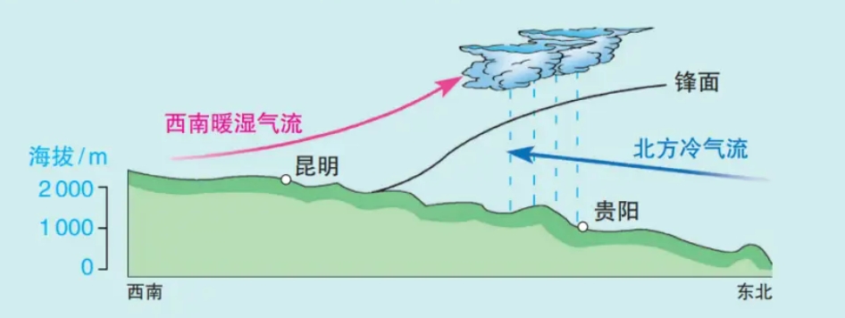 贵州位于云贵高原东部,是滇黔准静止锋(又称昆明准静止锋)的常年影响区,北方南下的冷空气受云贵高原地形阻挡,在贵州西部和中部徘徊不前,来自孟加拉湾的暖湿气流越过横断山脉后,在冷空气之上爬升,形成“两冷夹一暖”的典型气层结构。